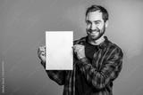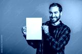 Handsome man holding vertical white a4 paper poster. Copy space. Smiling hipster guy in red plaid shirt on blue background.