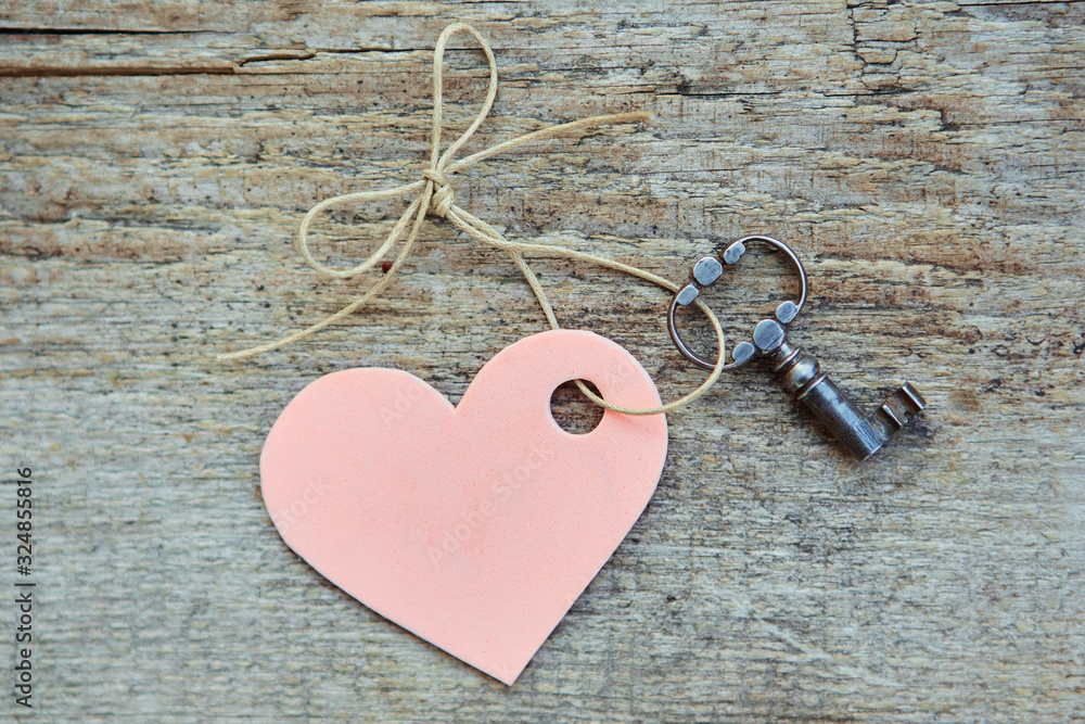 Handmade heart with antique key together lying on wooden Board. Valentine. Space for text. The view from the top