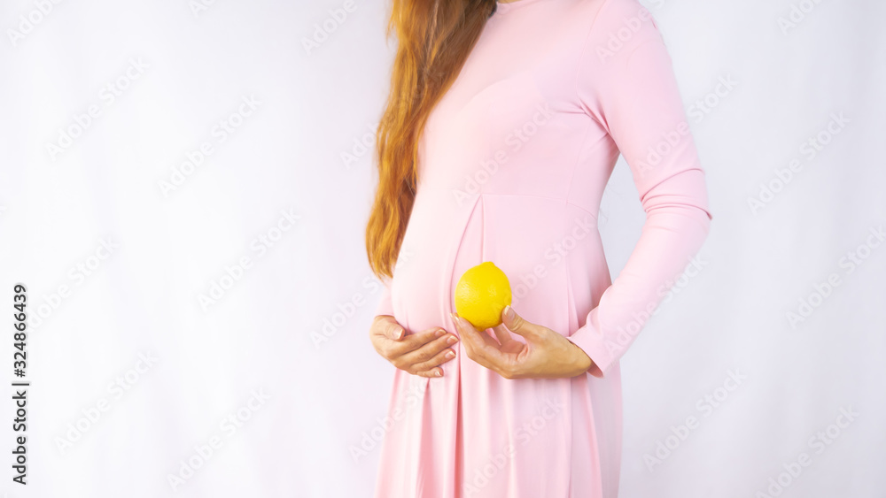 A close up photo of a pregnant young woman holding a lemon next to her belly showing the size of the baby in a beautiful dress. Photos of fetal growth at 14 weeks pregnancy. Healthy pregnancy diet.
