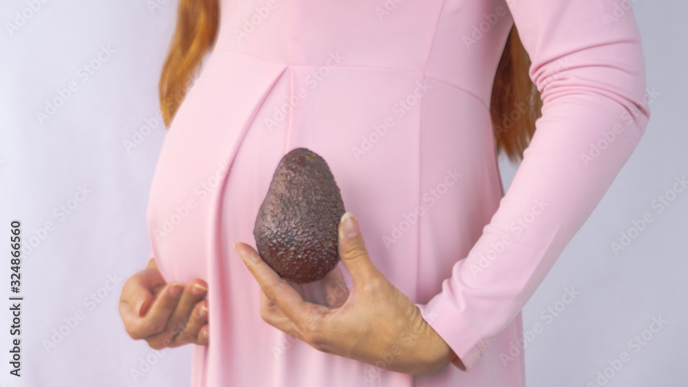 A close up photo of a pregnant young woman holding a avocado next to her belly showing the size of the baby in a beautiful dress. Photos of fetal growth at 16 weeks pregnancy. Healthy diet for weight.