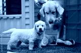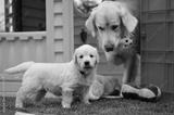Golden retriever puppy with his mother and toys