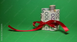 Banknotes 200, 100, 20 rooled and tied with red ribbon bow isolated on green background concept of economical financial gift present