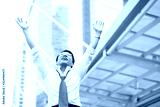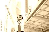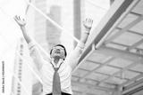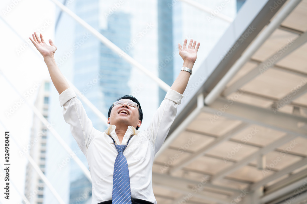 Asian businessman showing his gladness or happiness with pushing his hands up action, successful and cheer up moment business concept