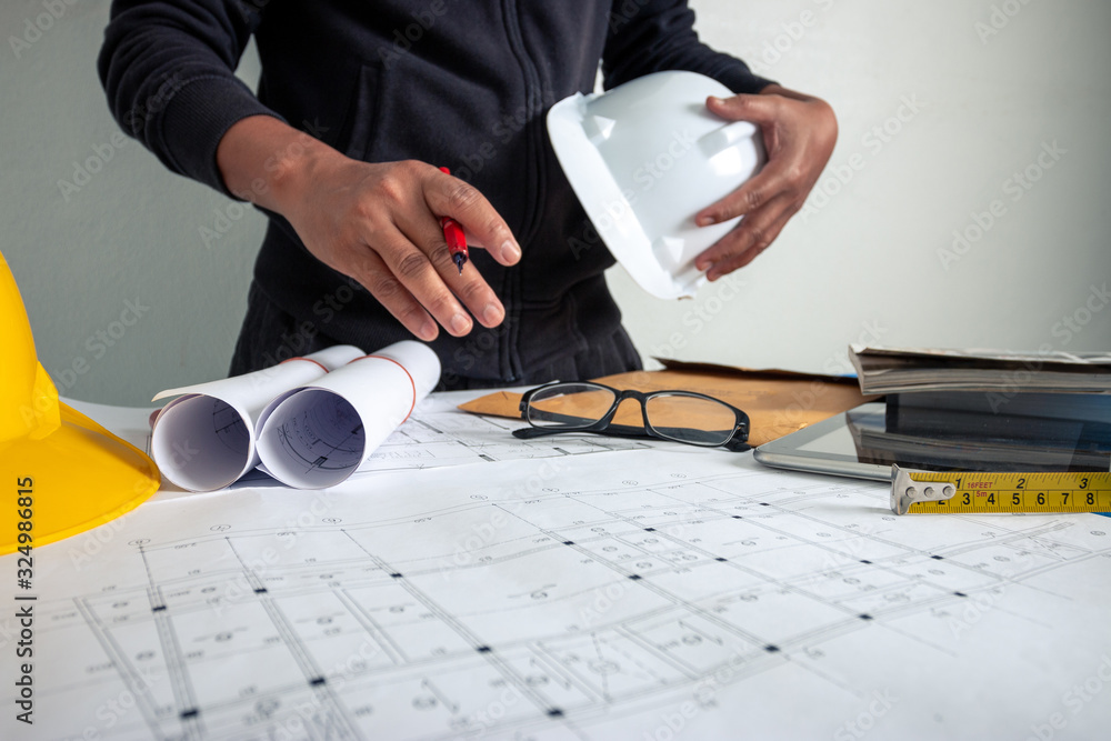 The architect is working to design the building at the office desk.