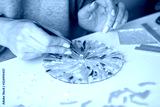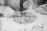 Woman puts out a mosaic of glass with tweezers, fusing, crafting