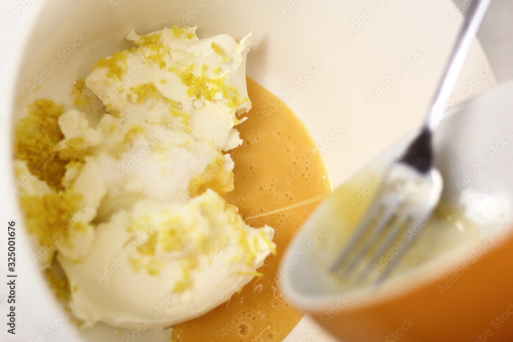 Add beaten egg into cream cheese with lemon rind and sugar. Making Lemon Mascarpone Pie Series.