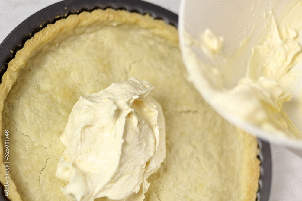 Add cheese filling into prebake pastry case. Making Lemon Mascarpone Pie Series.