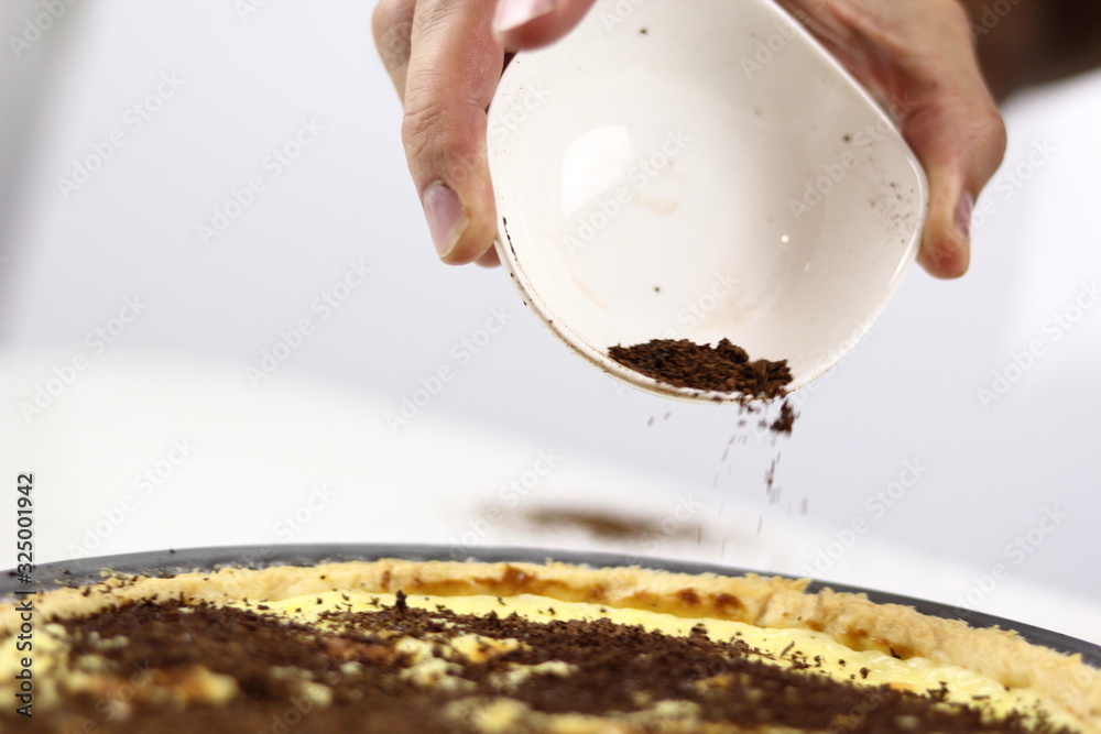 Sprinkle grated chocolate on top of tart. Making Lemon Mascarpone Pie Series.