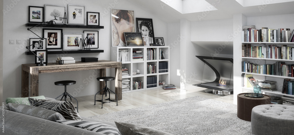 Attic Loft with Bioethanol Fireplace - panoramic 3d visualization
