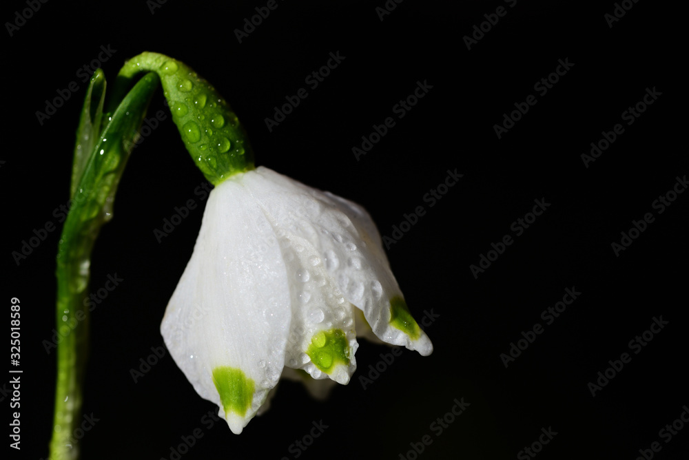 Close-up of a March mug in spring with white flower and drops of water against black background and space for text