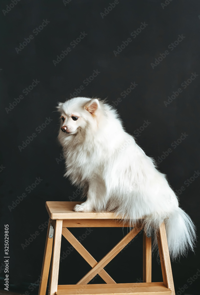 Adult spitz dog sitting on chair on black background.