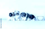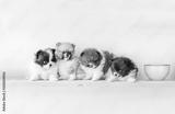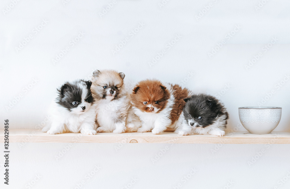 Four cute pomeranians puppies resting on wooden table in kitchen.