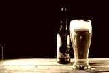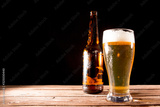 Cold tasty beer on a hot summer day. Glass and bottle of cold beer with foam on wood table with wood background