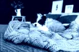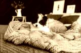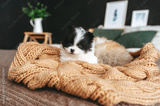 Cute pomeranians puppies sitting in a knitted basket in the bedroom.