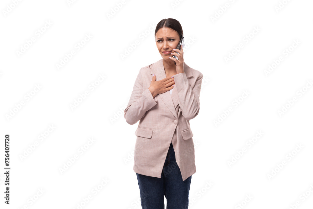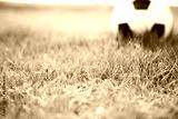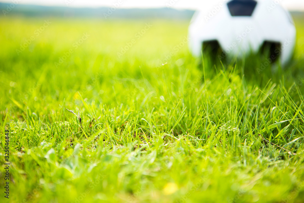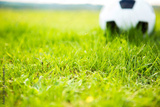 Soccer ball on a green lawn close up against clear blue sky and sun