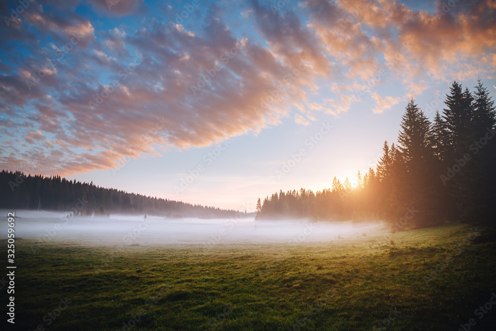 Fantastic misty pasture in the sunlight. Locations place Durmitor National park, Montenegro.