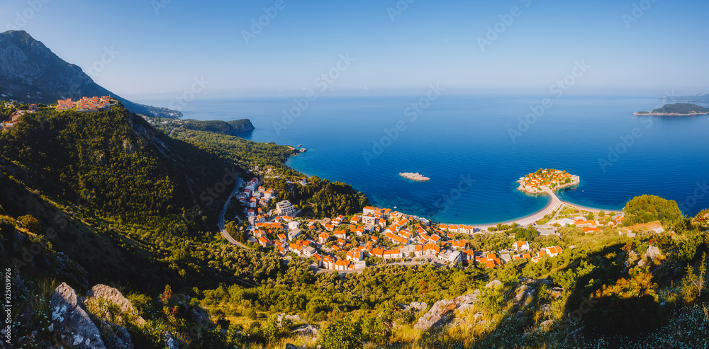 Aerial view of the small islet Sveti Stefan. Location Montenegro, Adriatic sea, Europe.