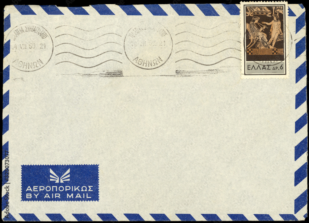 Luftpost airmail Griechenland Greece vintage retro Umschlag envelope Briefumschlag Post letter mail Antike Flöte nackt blau weiss Athen