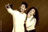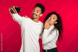 Young african american couple in white making selfie with smartphone on red studio background.Lovers match, love, holidays, happiness concept