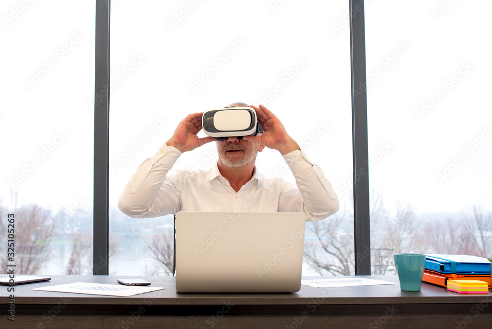Senior businessman wearing virtual reality headset as concept for business digitization
