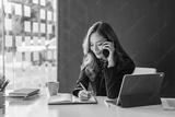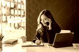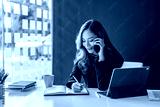 Happy young asian woman talking on the mobile phone and smiling while sitting at her working place in office.