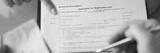 Focus on female hand holding paper folder and pointing for text. Sick patient with paper package with cannabis symbol on it and signing document. Healthcare and medical marijuana concept