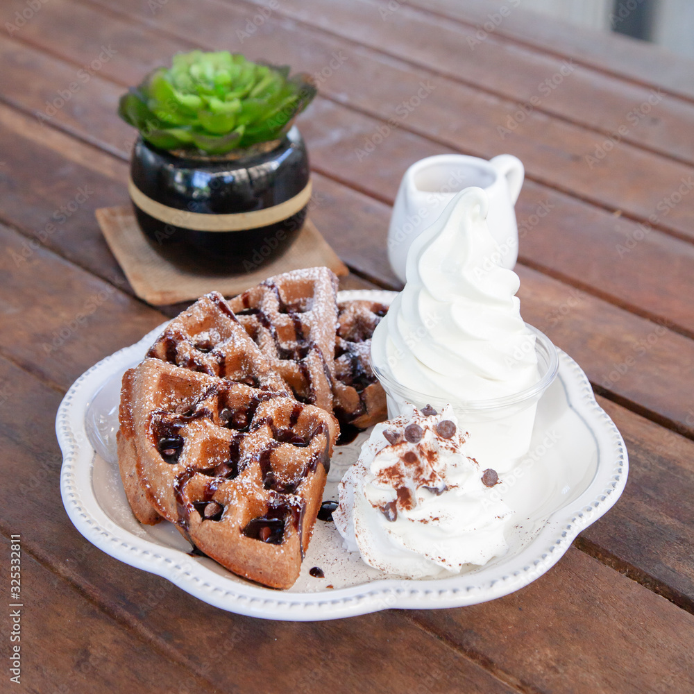 Chocolate waffle with soft serve ice cream