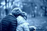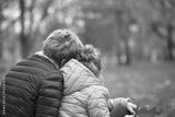 Mother and her daughter sit on their back in park cuddled to each other close up monochrome black and white