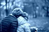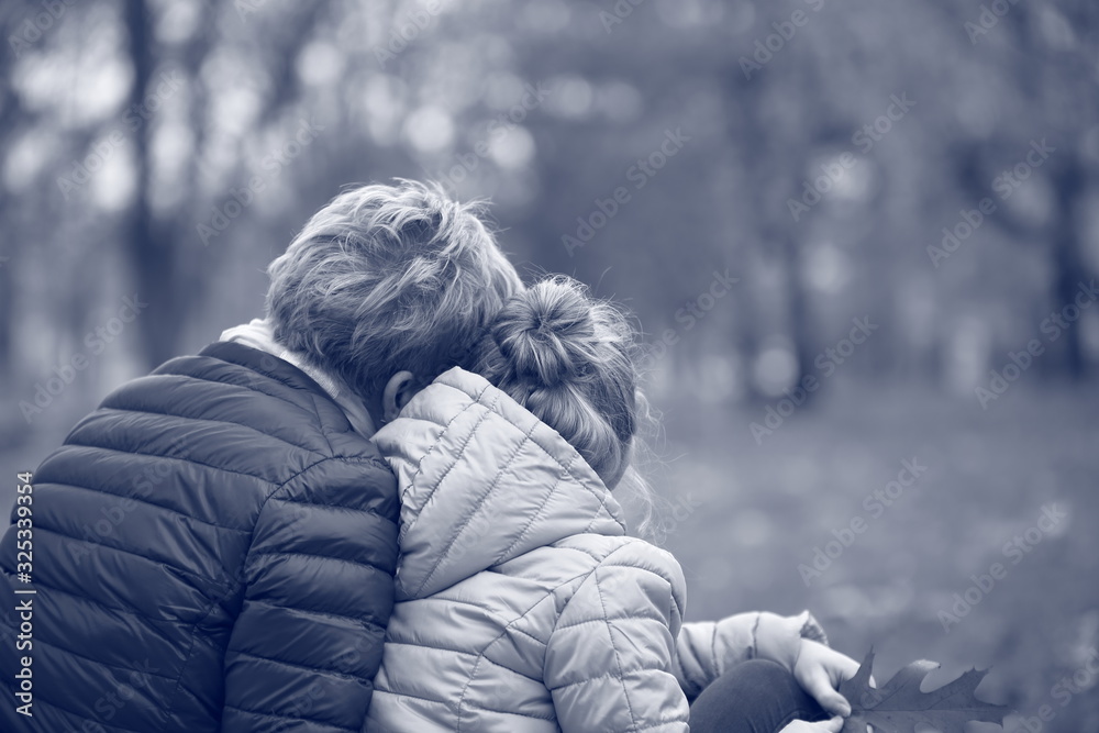 Mom and daughter hug each other standing back in park monochrome vintage style