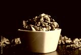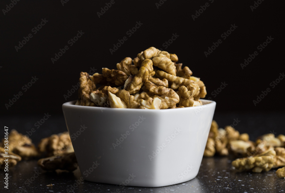 Peeled walnuts lying in a white bowl dark background warm light a healthy snack