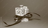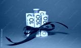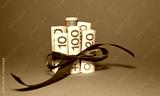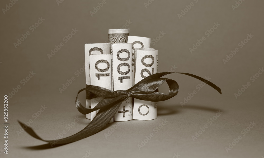 Banknotes of 100, 20 and 10 Polish zloty rolled in rolls and tied with ribbon, bow, close up isolated concept of financial / economical present / gift, monochrome in sepia