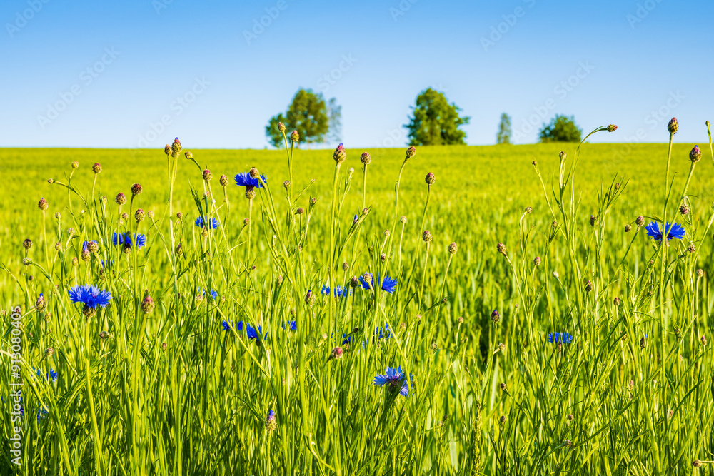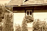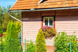 Facade of traditional house on green meadow in small village in Beskid Sadecki Mountains near Nowy Sacz, Poland