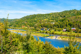 View of Dunajec river valley and green hills near Nowy Sacz town, Beskid Sadecki Mountains, Poland