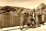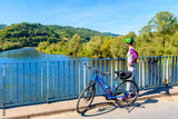 Young woman tourist looking at Dunajec river from bridge on Velo Dunajec cycling road near Nowy Sacz, Poland