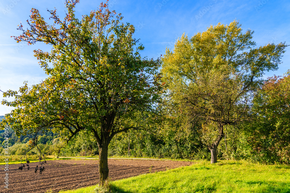 Trees and green farming fields in Beskid Sadecki Mountains near Nowy Sacz, Poland