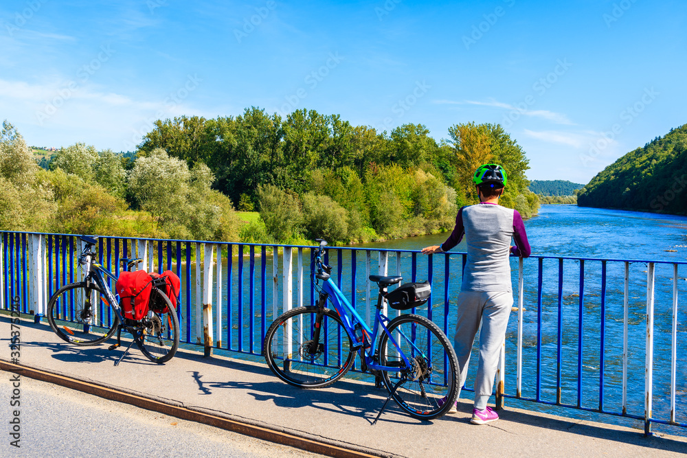 BESKID SADECKI MOUNTAINS, POLAND - SEP 15, 2019: Young woman tourist looking at Dunajec river from bridge on Velo Dunajec cycling road near Nowy Sacz, Poland.