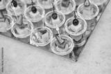 Assorted canapes of fruit and cheese on a glass platter on the background of glasses and champagne. Catering