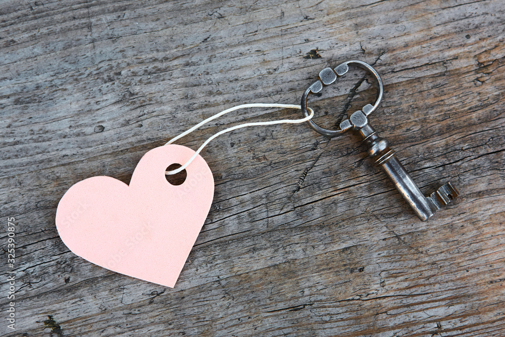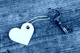 Heart symbol on key tag. Concept of love, romance and vintage lifestyle.