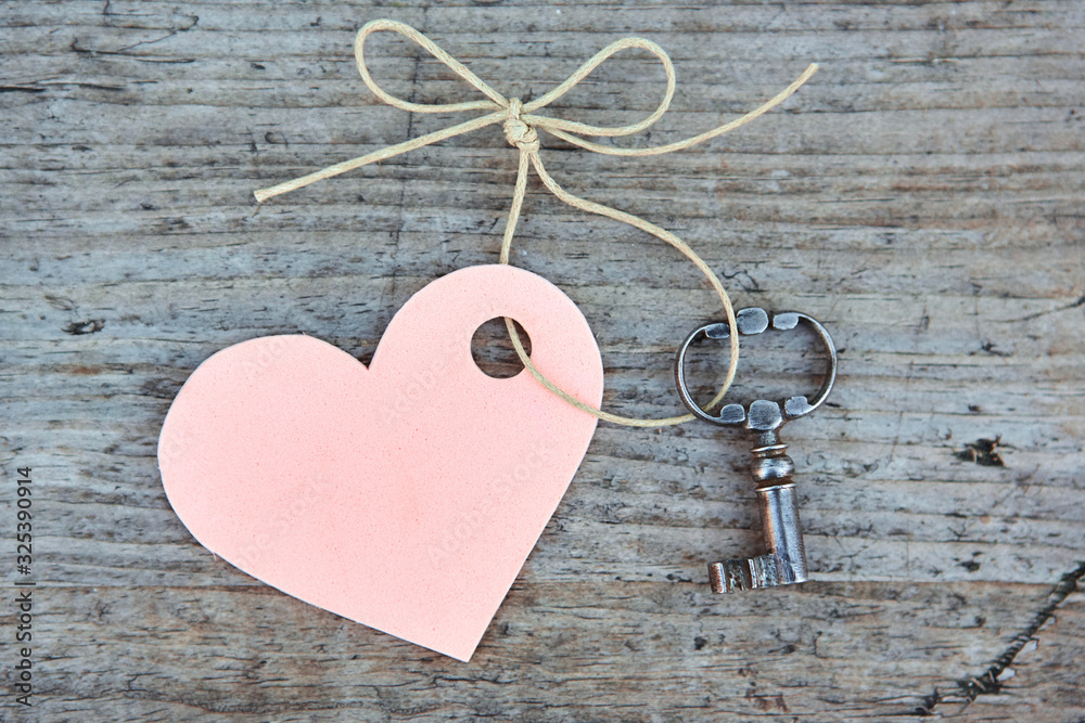 Handmade heart with antique key together lying on wooden Board. Valentine. Space for text. The view from the top