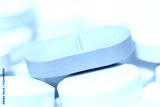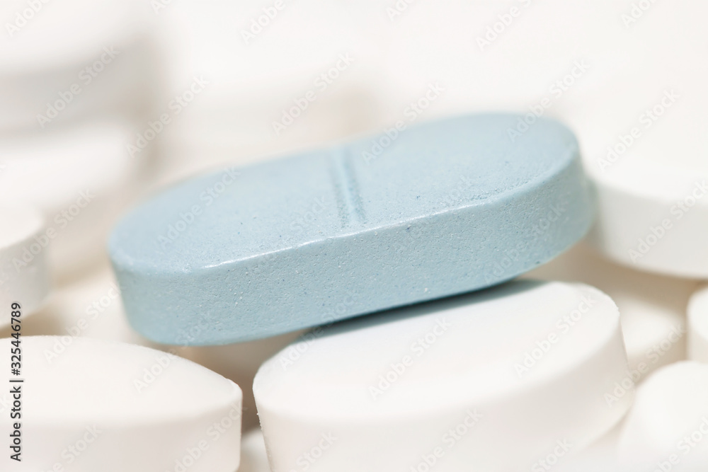 Blue pill with bunch other tablets macro