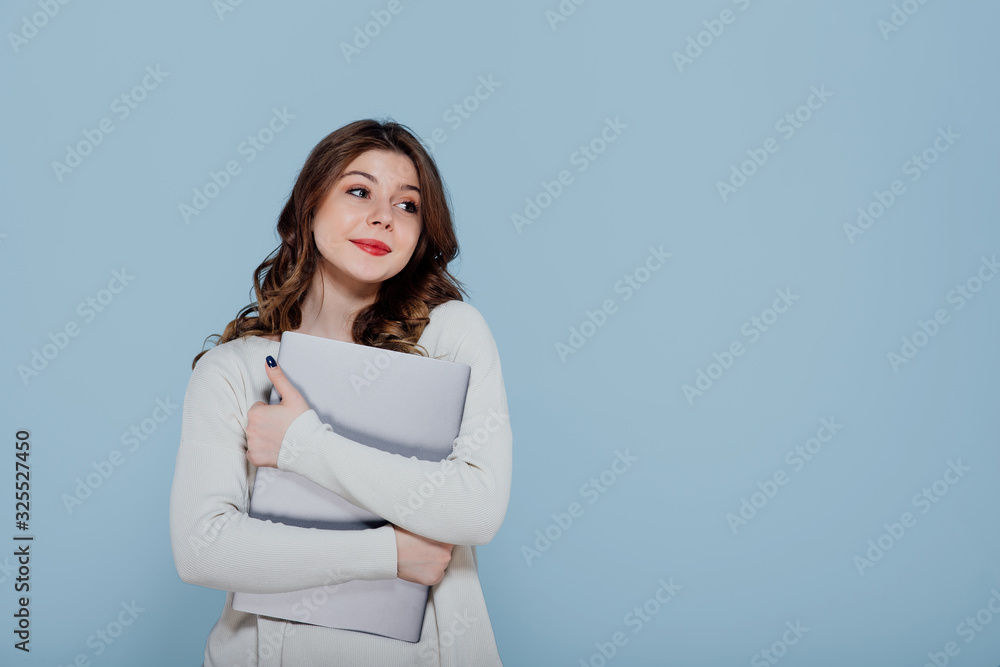 happy girl hugs a laptop, looks away, isolated on a blue background