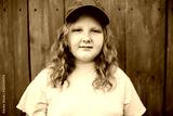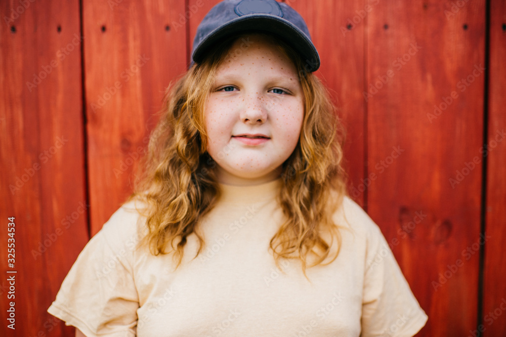 Beautiful chubby girl with long hair in yellow t-shirt stands against the wooden wall in village