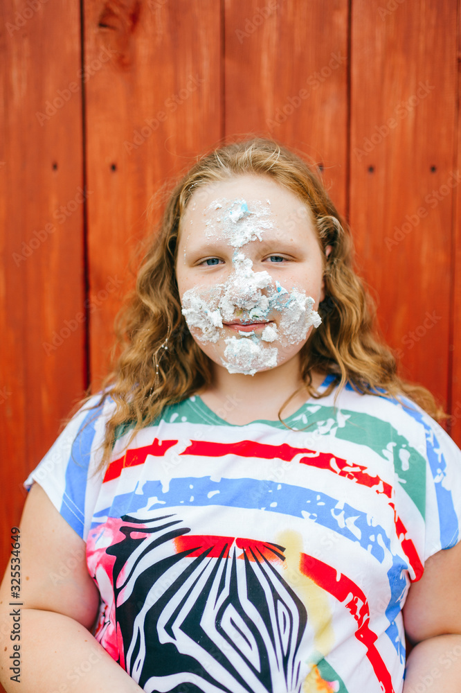 Beautiful chubby girl with long hair smear the cake across her face against the wooden wall in village