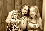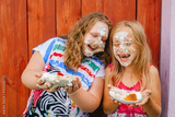 Little cute girl with blond hair and pink dress with her older sister play and smear the cake across each other's faces against the wooden wall