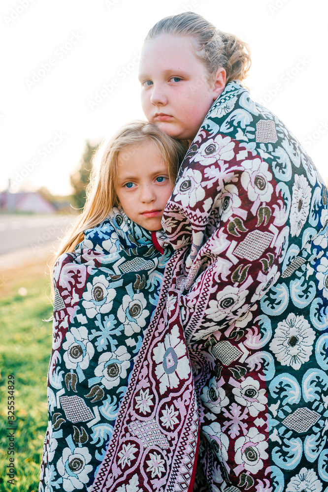 Sisters froze, wrapped up in a veil and stand outdoors, morning in a village