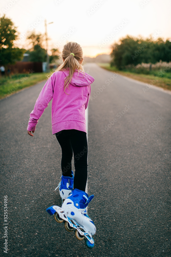 Cute young girl in pink hoody roller-skates on the village road in the evening