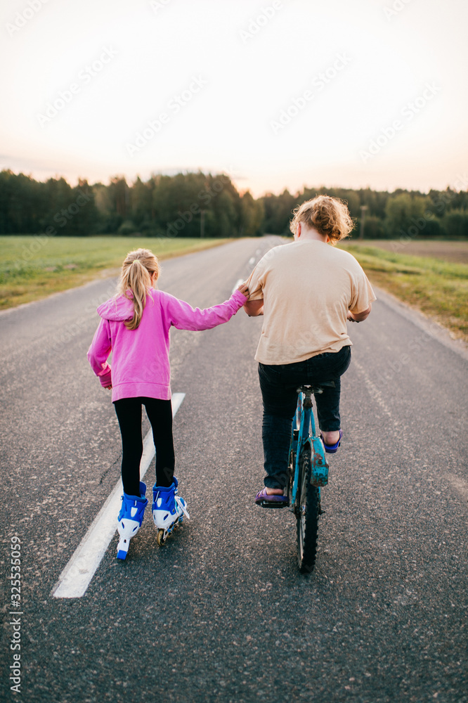 Pretty young girl in pink hoody roller-skates on the village road in the evening with her elder sister