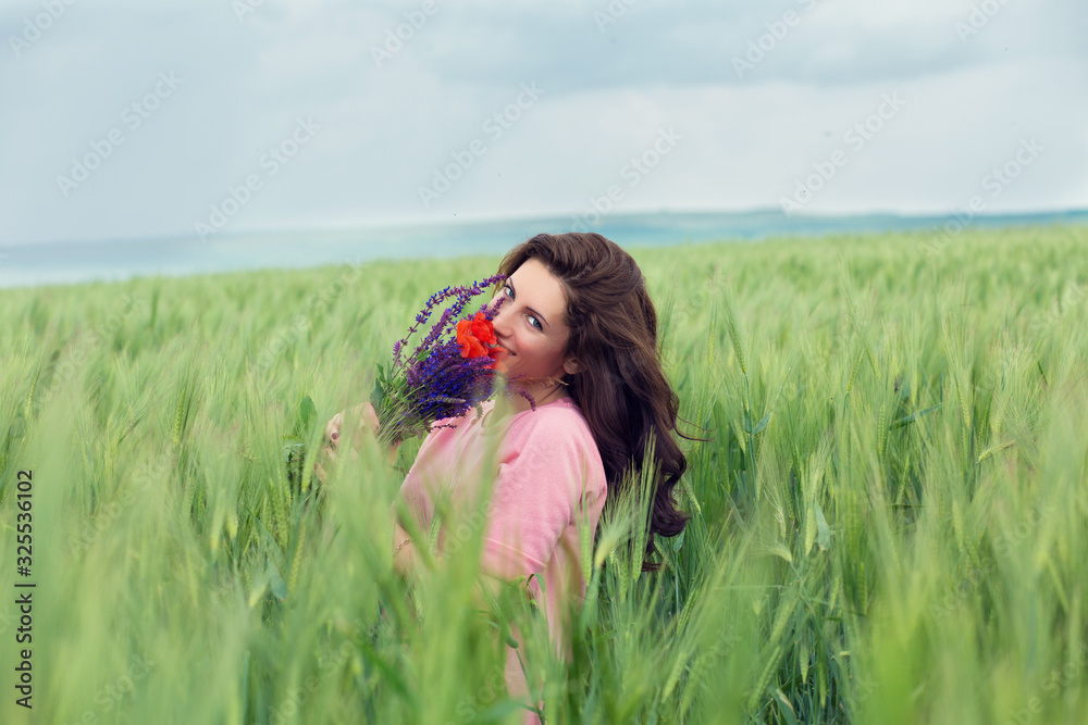 Portrait of a beautiful woman girl holding bunch bouquet of poppy and lavender smelling flowers on a summer day, looking at you camera