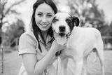 Picture of beauteous woman sits with her lovely dog on the bridge in the park and rejoices