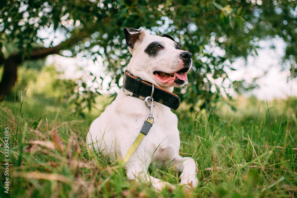 Beautiful big black and white dog relaxes in the summer in the garden or park in good weather